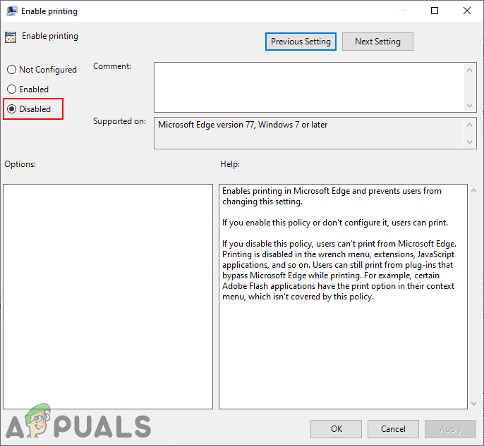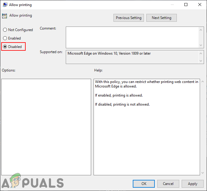- You can always enable the printing again by changing the toggle option back to Not Configured or Enabled in step 8.