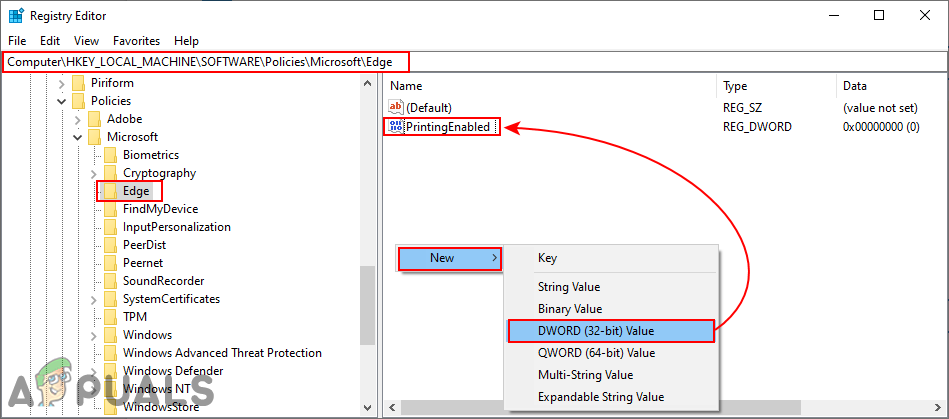 Creating the missing key - Now right-click on the right pane of the Edge key and choose the New > DWORD (32-bit) Value option. Name this new value as “PrintingEnabled“.