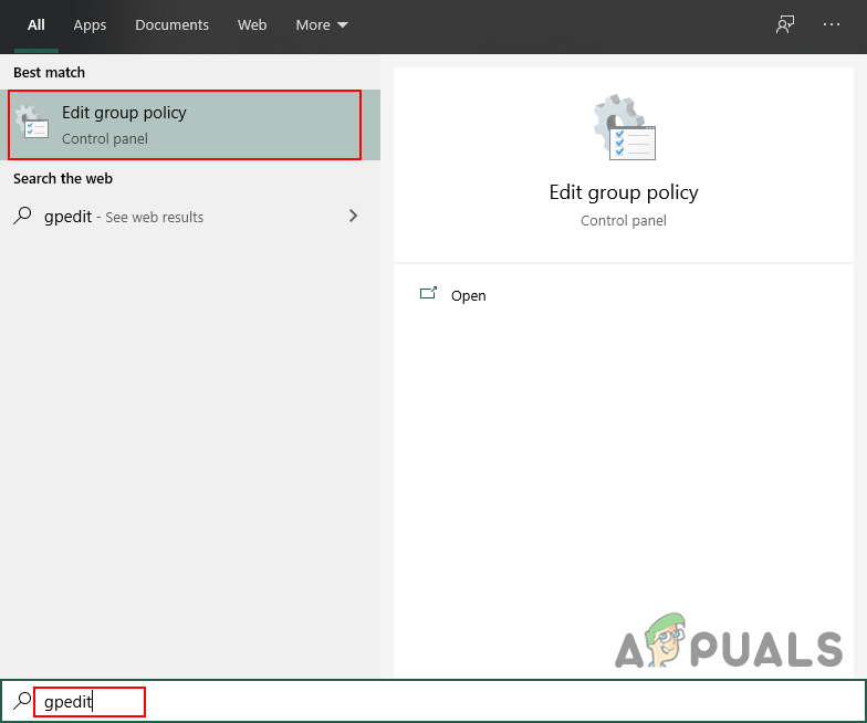 - Hold the Windows key and press S to open a Windows search feature. Then type “gpedit” in the search box and click on the Edit group policy icon to open it.