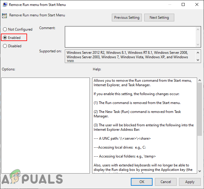 - To enable the Run command back, simply change the toggle option back to Not Configured or Disabled in step 3.