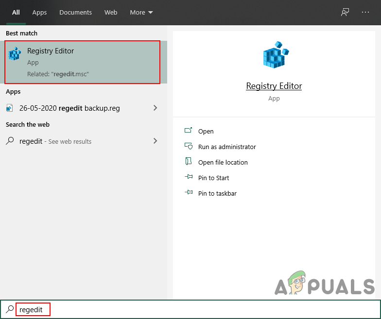 - Hold the Windows key and press S to open the Windows search feature. Now type “regedit” in the search box and open the Registry Editor. If prompted by UAC (User Account Control) dialog, then choose the Yes option.