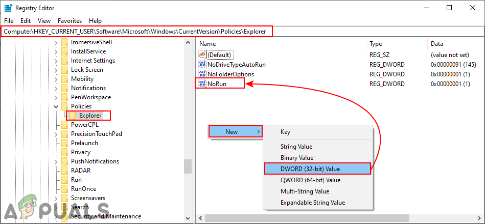 - In the Explorer key, you need to create a new value by right-clicking on the right pane and choosing the New > DWORD (32-bit) Value option. Now name the value as “NoRun” and save it.