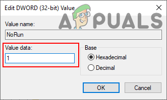 Creating a new value in the Registry Editor - Double-click on the NoRun value and then change the value data to 1.