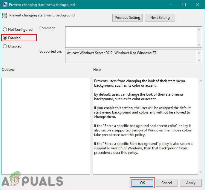 Opening the policy - Double-click on the Prevent changing start menu background policy in the right pane. A new window will appear, here modify the toggle from Not Configured to Enable. Then, click on the Apply/Ok button to save the changes.