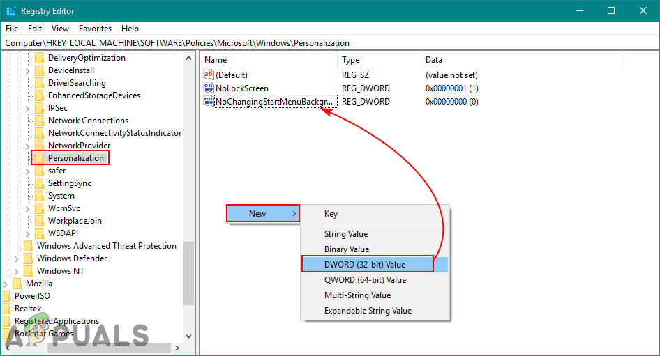 - Create a new value named NoChangingStartMenuBackground by clicking anywhere on the right pane and choosing New > DWORD (32-bit) Value. If it already exists under the key, then skip to the next step.