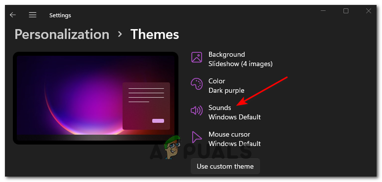 Accessing the Themes tab inside the Settings menu on Windows 11 - Next, from the upper section of the screen, click on Sounds (Windows Default).