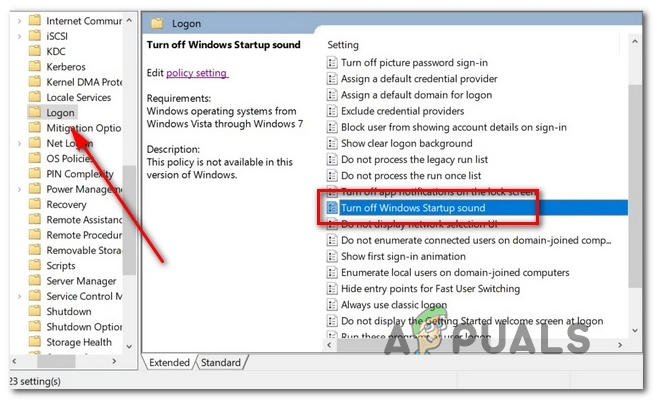 - After you arrive in the correct location, ensure that the Logon folder is selected from the menu on left, then move over to the right-hand side menu and double-click on Turn off Windows Startup sound.
