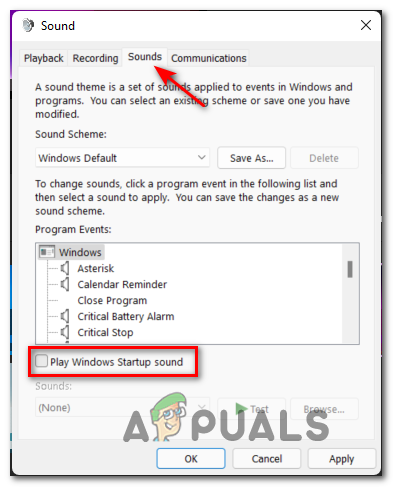Accessing the Sounds menu - Once you’re inside the Sound window, ensure that the Sounds is selected, then go under Program Events and uncheck the box associated with Play Windows Startup Sound.