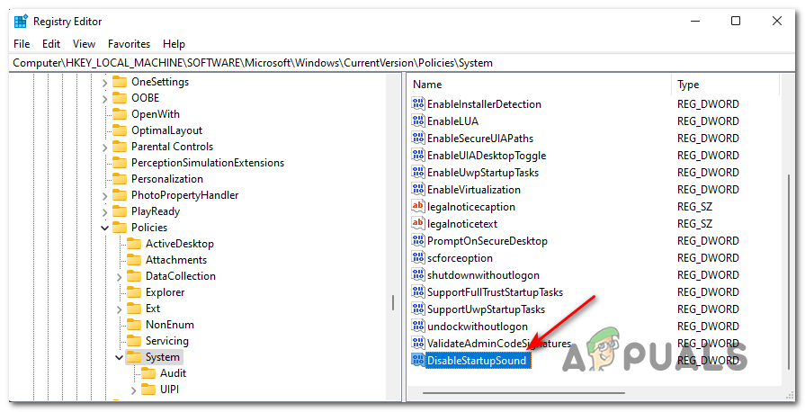 - Once you’re inside the correct location, ensure that the System Registry cluster is selected, then move over to the right-hand section and locate the DisableStartupSound REG-DWORD.