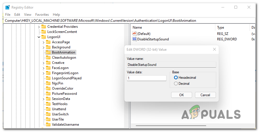 - Next, double-click on the DisableStartupSound key and set the Base to Hexadecimal and the Value data to the following, depending on what you wish to achieve: