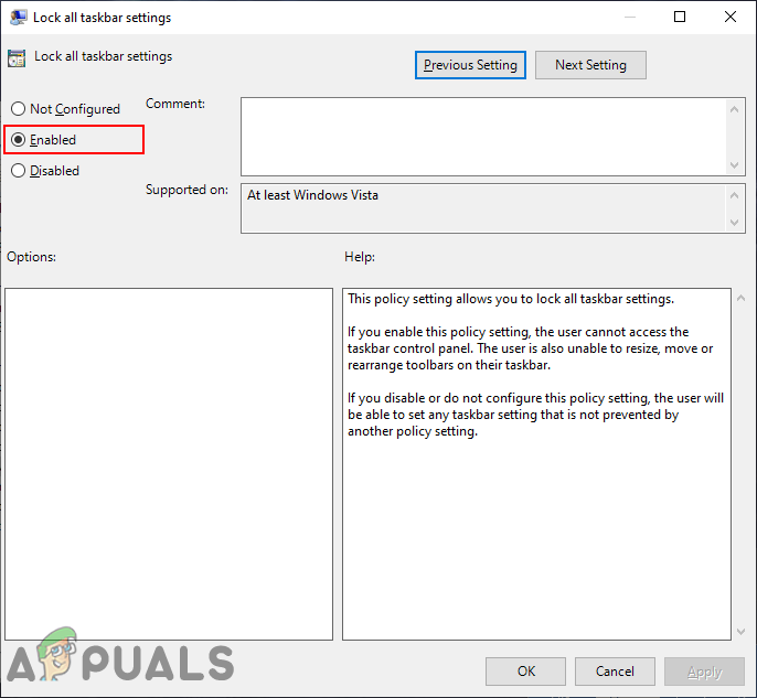 Navigating to the settings - Double-click on the setting “Lock all taskbar settings” and it will open up in another window. Now in here, change the toggle option from Not Configured to Enabled.