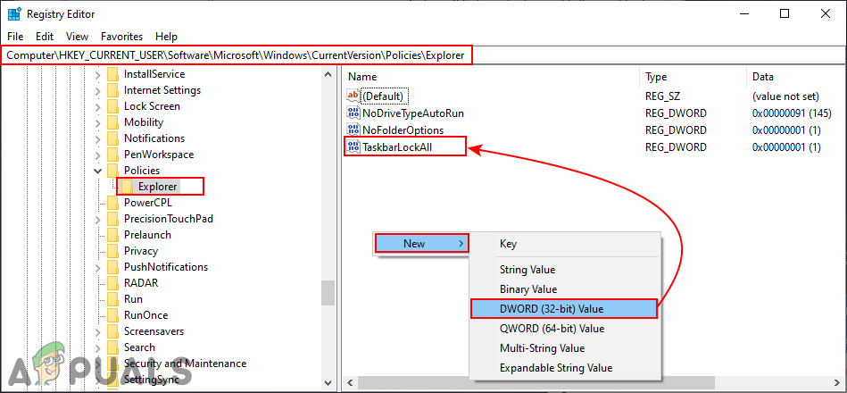 - In the Explorer key, right-click on the right pane and choose the New > DWORD (32-bit) Value option. Name this value as “TaskbarLockAll“.