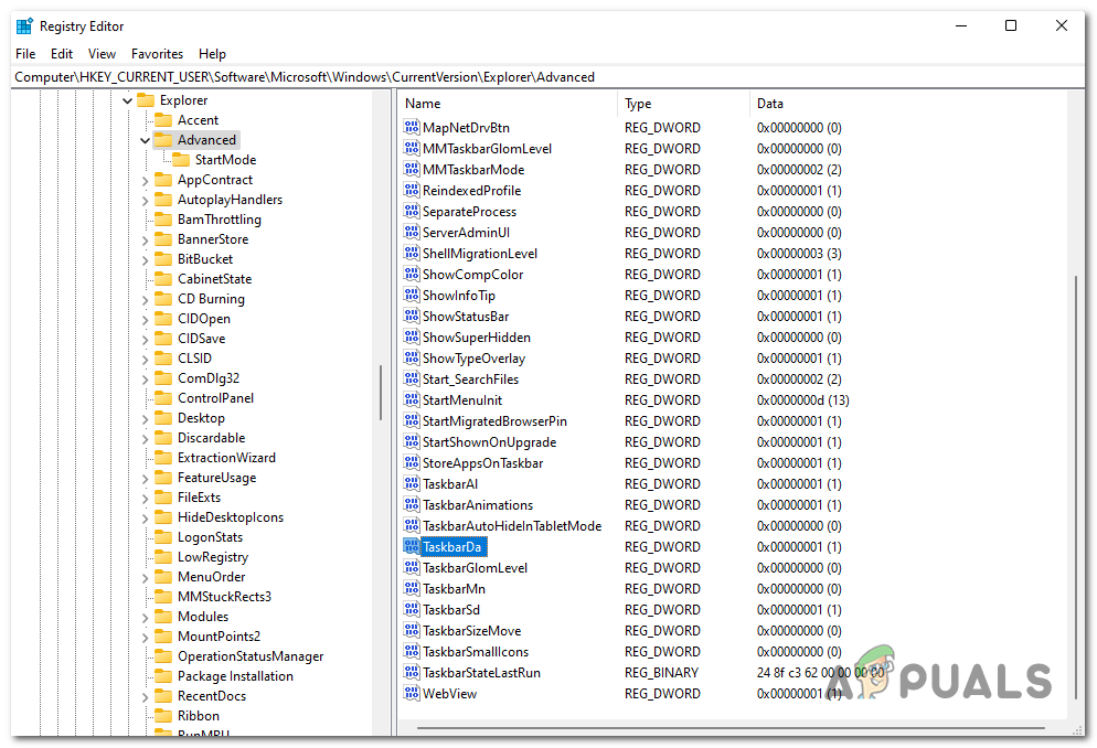- Once you are inside the Advanced folder, scroll through the list and search for the TaskbarDa value. When you find it, double-click it.