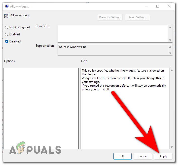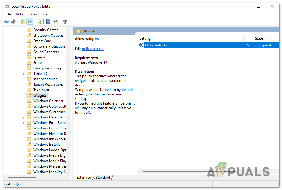 Navigating through the Group Policy Editor to get to the Widgets folder - Now you have to double click on Allow widgets button to open the settings in particular. There, you will have to select the Disabled button, then click on the Apply button.