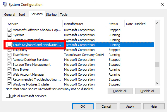- Uncheck “Touch Keyboard and Handwriting Panel Service” to disable it.