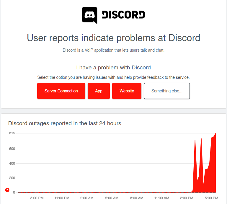 Over at downdetector, there is a sudden surge in the number of problems indicated by users at Discord. This is, evidently, the exact same issue that we all are facing right now.