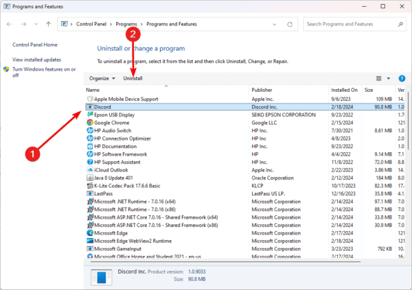 Opens Programs and Features - Locate Discord in the list, select it, then click Uninstall.