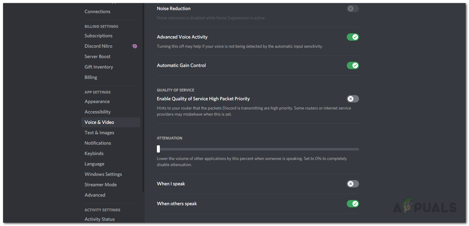 As it turns out, there exists a feature in Discord that makes your audio packets a high priority. When this feature is enabled, it basically hints to your router that the packets that are being transmitted by Discord are high priority. This feature can turn out to cause the disconnecting issue on some network connections. If this case is applicable, you will have to simply disable the feature from your Discord’s voice settings and everything should be good to go. To do this, follow the instructions given down below: