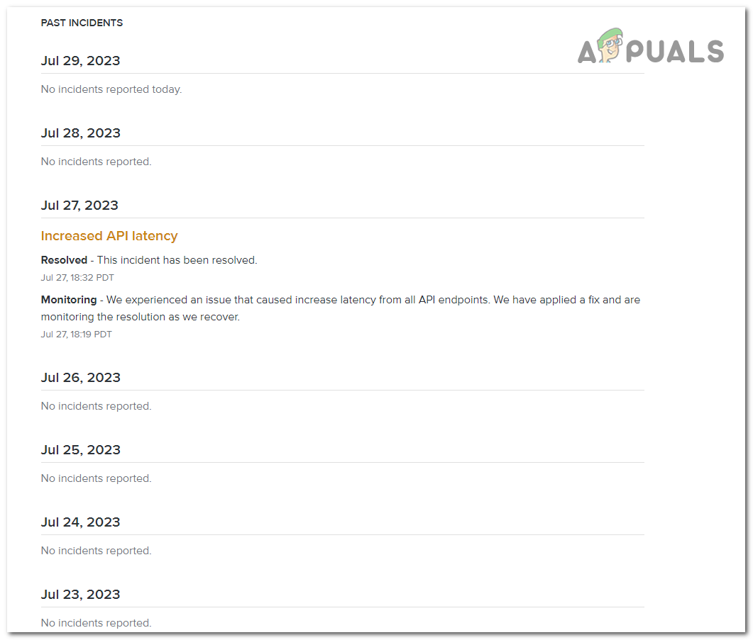 - Scroll down, under PAST INCIDENTS will be reports regarding Server outages and what issue it caused.