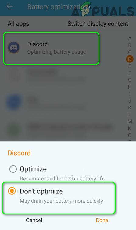 Battery optimization can extend your phone’s battery life but may also close apps running in the background. To avoid Discord being shut down, disable battery optimization for the app: