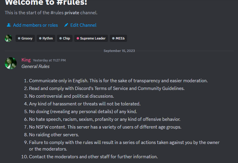 Now that your rules channel is ready, you can use these rule templates to communicate expectations clearly and establish a safe, enjoyable server environment: