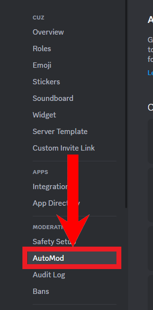 Select Server Settings - In Server Settings, scroll to the Moderation section and click on AutoMod.