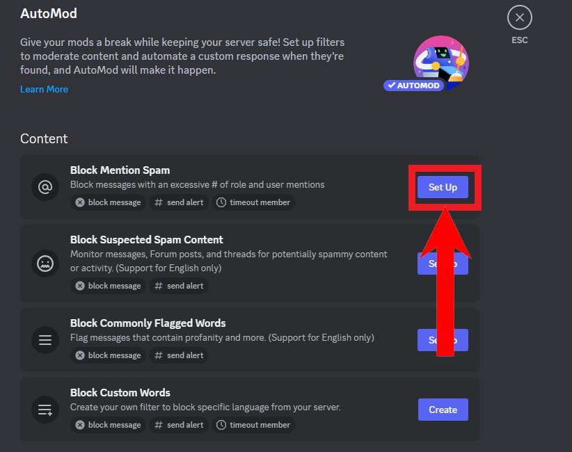 Select AutoMod - You can configure various moderation settings here. For example, to block excessive @mention spam, click Set Up.