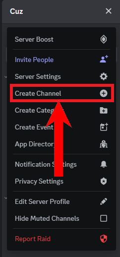 Click on the server name or the drop-down arrow - Select Create Channel from the list.