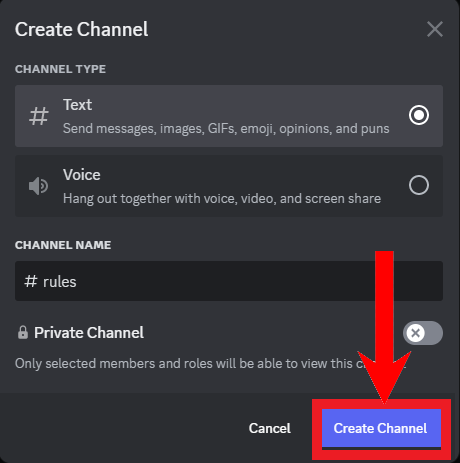 Select Create Channel - Choose Text for Channel Type, and name the channel “rules”. Click Create Channel.