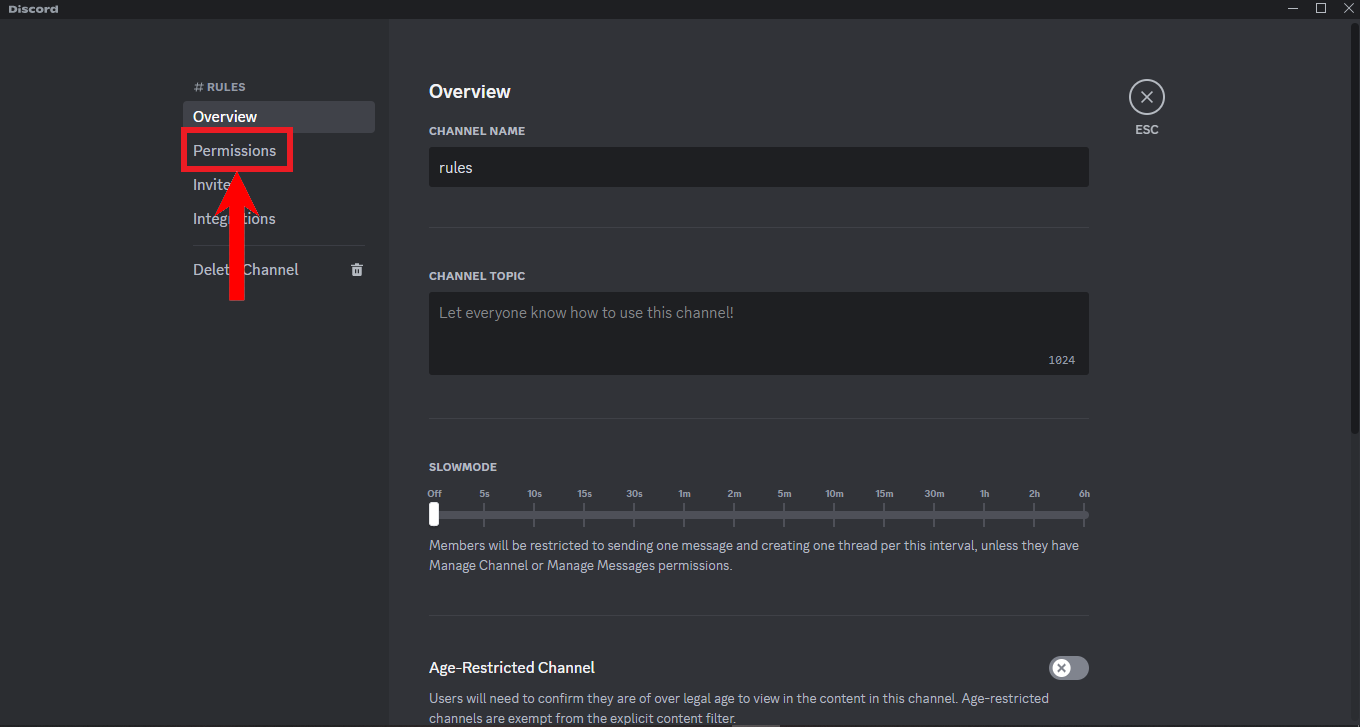 Select Permissions - Configure the permissions as indicated in the images below:Setting correct permissions is crucial to ensure only admins can post, and all members can read the rules without making changes.