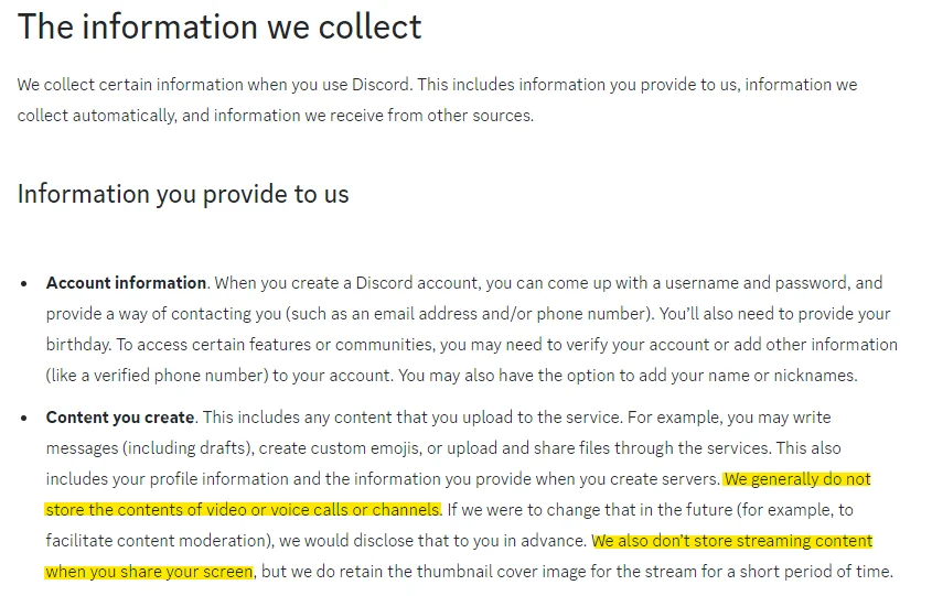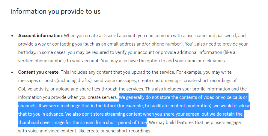 The user has already highlighted the required sentences, making our job easier. As showcased below, the ToS read, ‘We generally do not store the contents of video or voice calls or channels. Similarly, Discord (as per the old ToS) will not store/record anything (video or even voice) streamed over its screen-share feature.