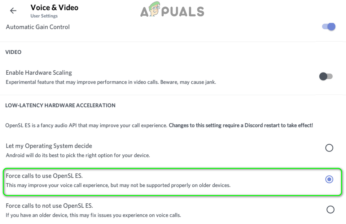 - Then, under the option of Low Latency Hardware Acceleration, select Force Calls to Use OpenSL ES.