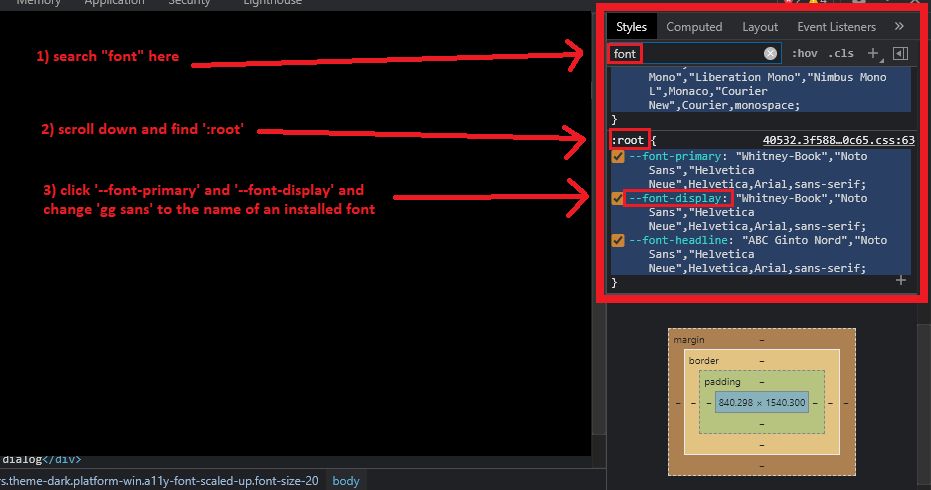 Developer Menu Discord - Find the Styles and type in :root. Scroll down to the font section.