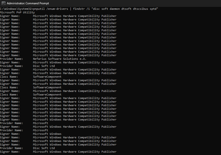 pnputil /enum-drivers | findstr /i "disc soft daemon dtsoft dtscsibus sptd hidgamemap rewasd"