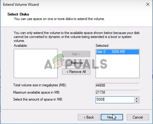 - The Extend Volume Wizard should appear promptly. Click Next in order to proceed to the next screen. The drive you have chosen should be selected automatically.