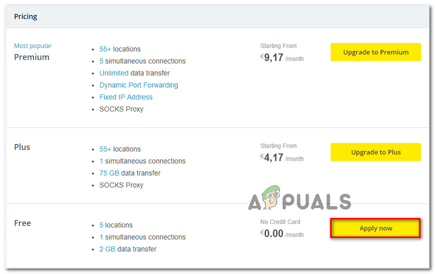 Creating an account with Hide.me - After you manage to successfully sign in to the account that you have just set up, make your way through Pricing > Free and click on the Apply Now button to activate the free plan.