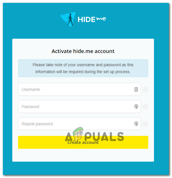 - Click on the verification link, then insert an appropriate user and password that you want to use for Hide.me. After everything is set up, click on Create Account.