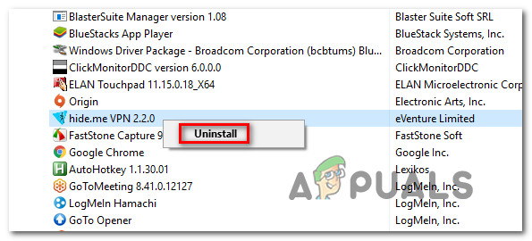Type appwiz.cpl and Press Enter to Open Installed Programs List - Once you’re inside the Programs and Features screen, scroll down through the list of applications and locate the VPN client that you’re currently using.