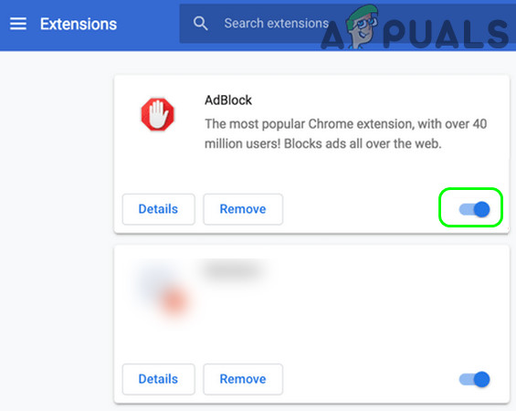 - Then in the Extensions Menu click on the Adblock and disable it.