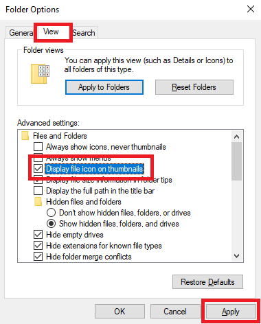- Uncheck the Display file icon on thumbnails option and then click Apply.