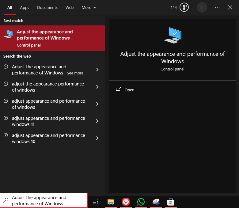 - Click the Windows icon on the bottom left and type Adjust the appearance and performance of Windows.