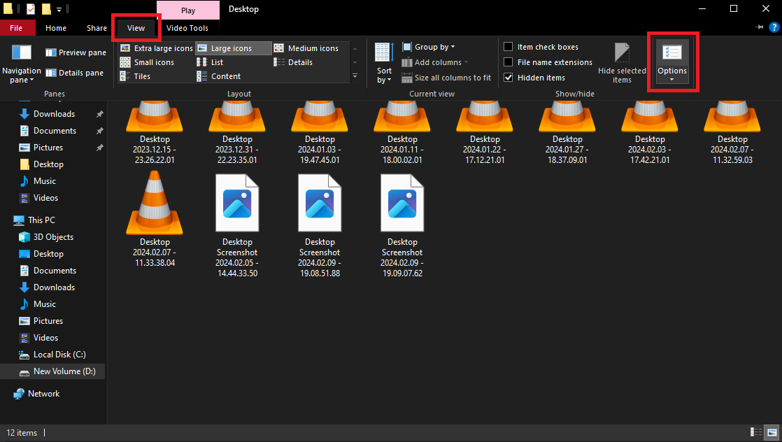 - Navigate to the top of the folder, click the View tab, and choose Options.