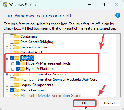 - Hit Enter to open the window. Here, enable the Hyper-V by selecting it.