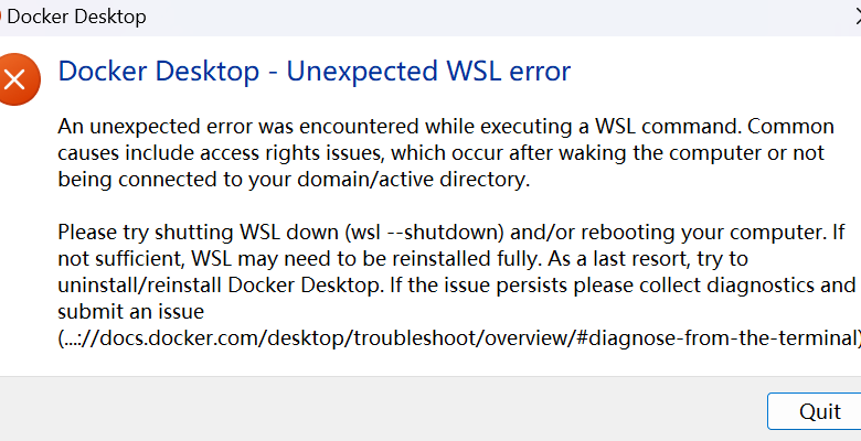 “Docker Desktop – Unexpected WSL error: An unexpected error was encountered while executing a WSL command” occurs when there is a problem with the Windows Subsystem for Linux (WSL), which Docker relies on to run Linux containers on Windows.