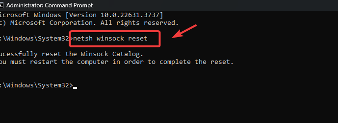 Since this error can result from corrupted network settings, we can start by resetting Winsock. Winsock defines how network-related applications and software can access network services. If the network settings become corrupted, it can lead to network issues, resulting in this WSL (Windows Subsystem for Linux) error message. Therefore, by resetting Winsock, all your network settings will go back to their default state, which might resolve this issue.