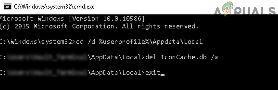 CD /d %userprofile%\AppData\Local DEL IconCache.db /a EXIT