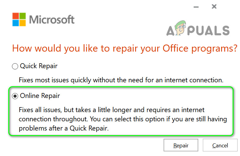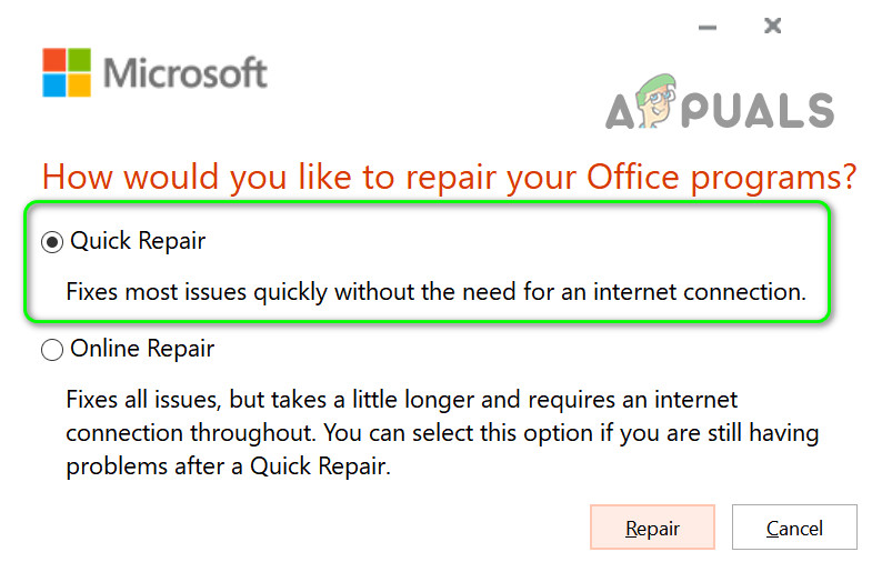 Modify the Office Installation - Now choose the Quick Repair option and click on the Repair button.