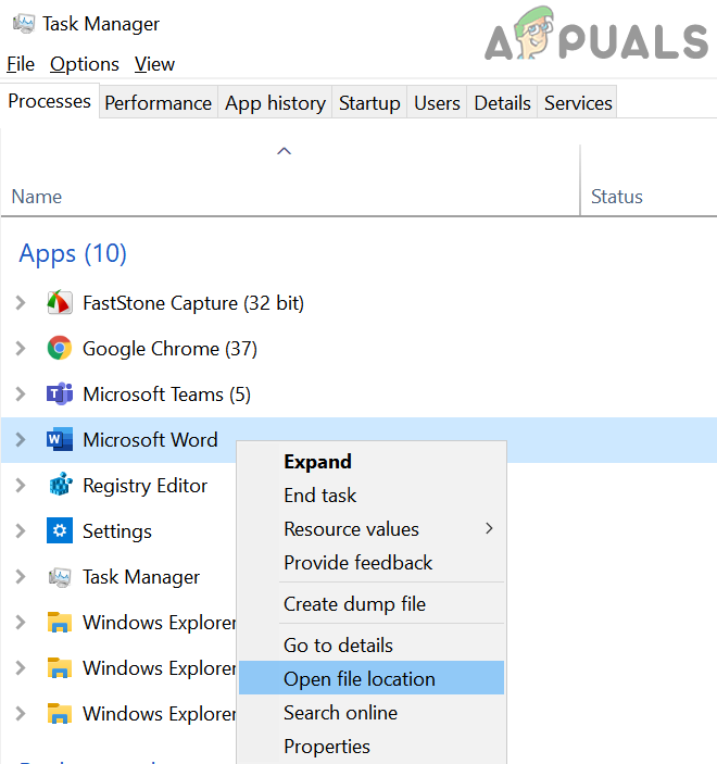 Open the Task Manager of Your System from the Taskbar - Now, right-click on the process of MS Word and choose Open File Location.