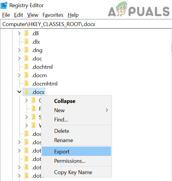 - Now, in the left pane, right-click on the .docx key and select Export.