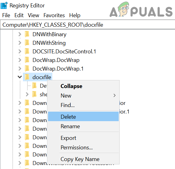 - Then, in the left pane, right-click on the docxfile key and select Delete.